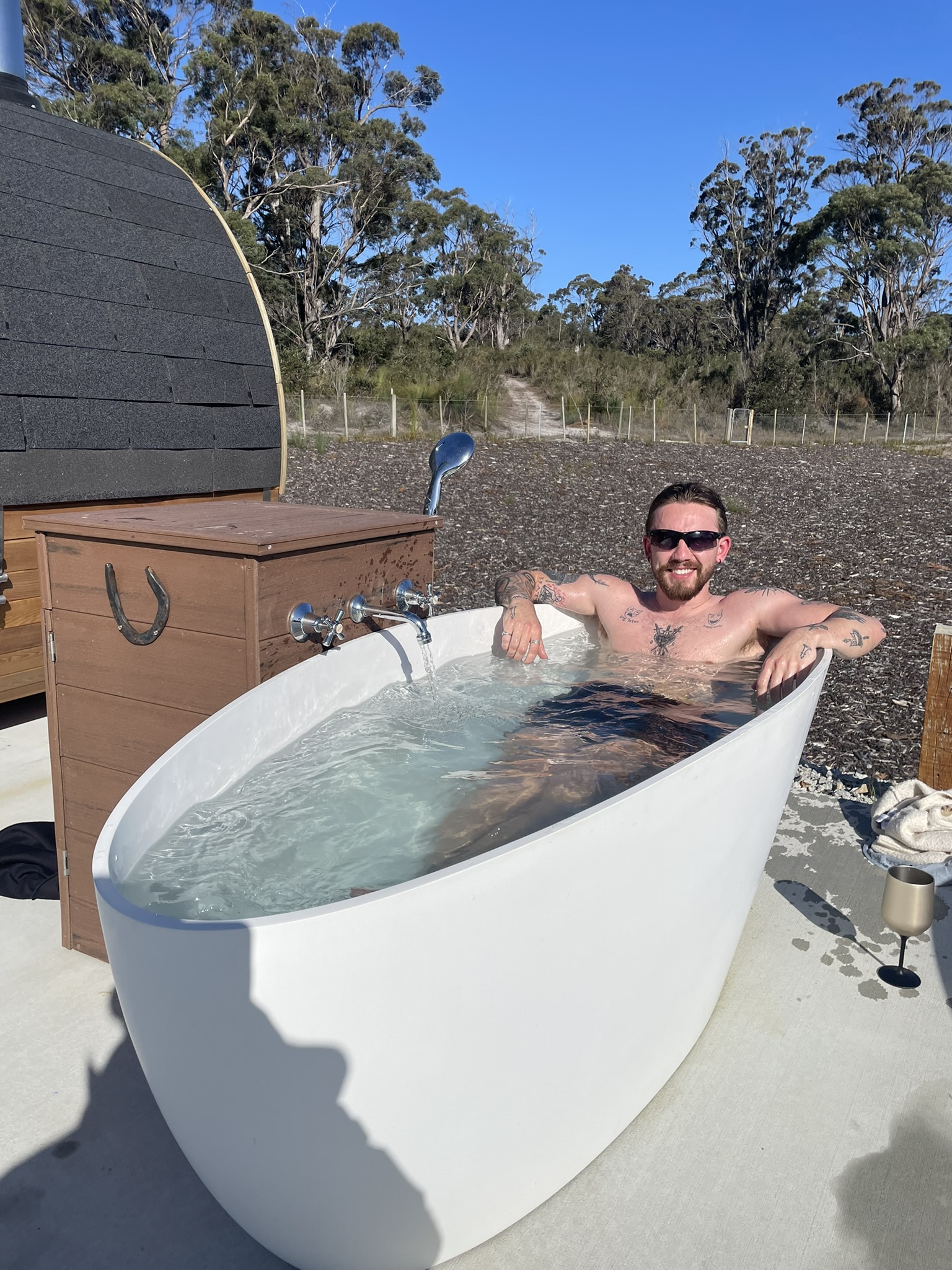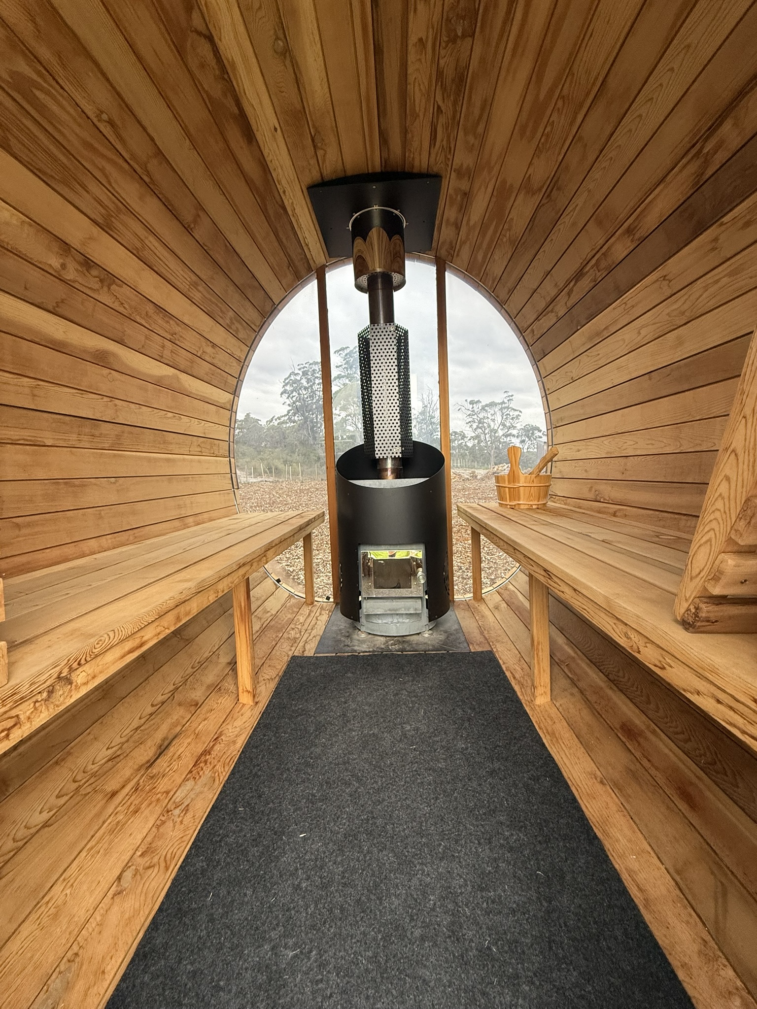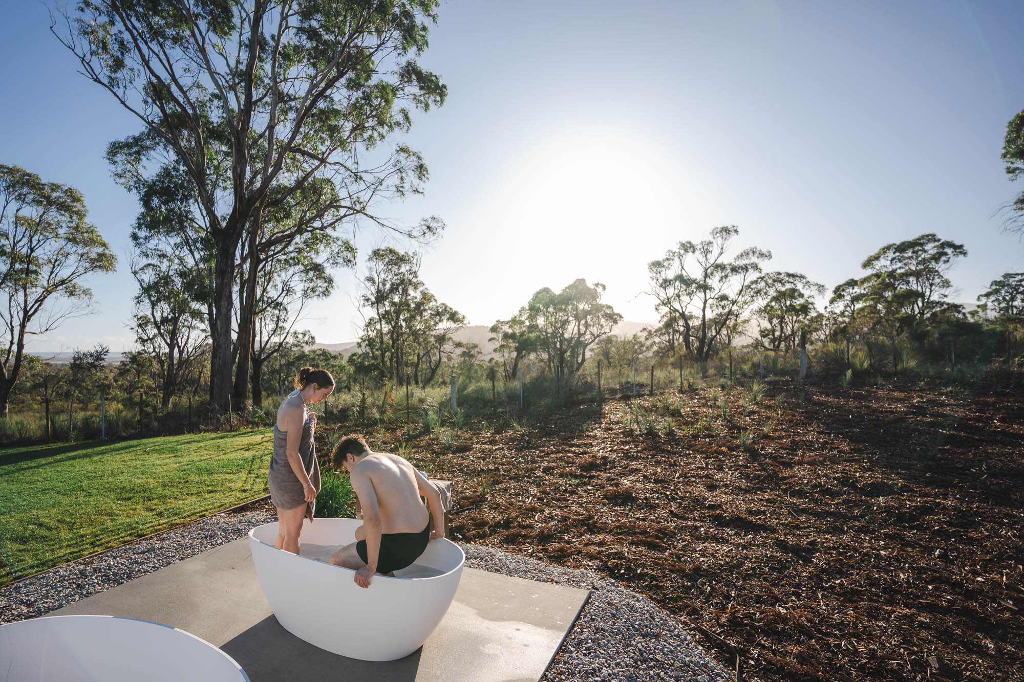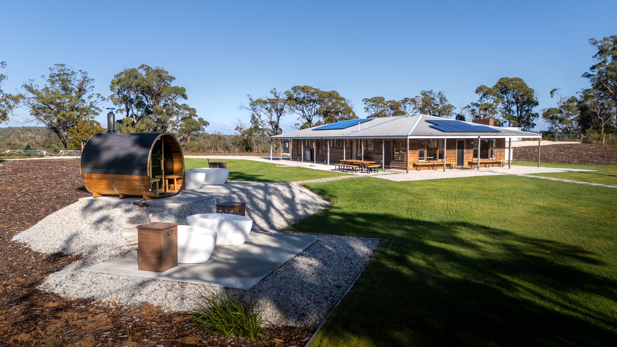 On the estate you’ll find considered, low-impact comforts: outdoor baths beneath the stars and a panoramic sauna that look across the coast. These features are intentionally simple and place-centred — designed to complement time in the landscape rather than distract from it.